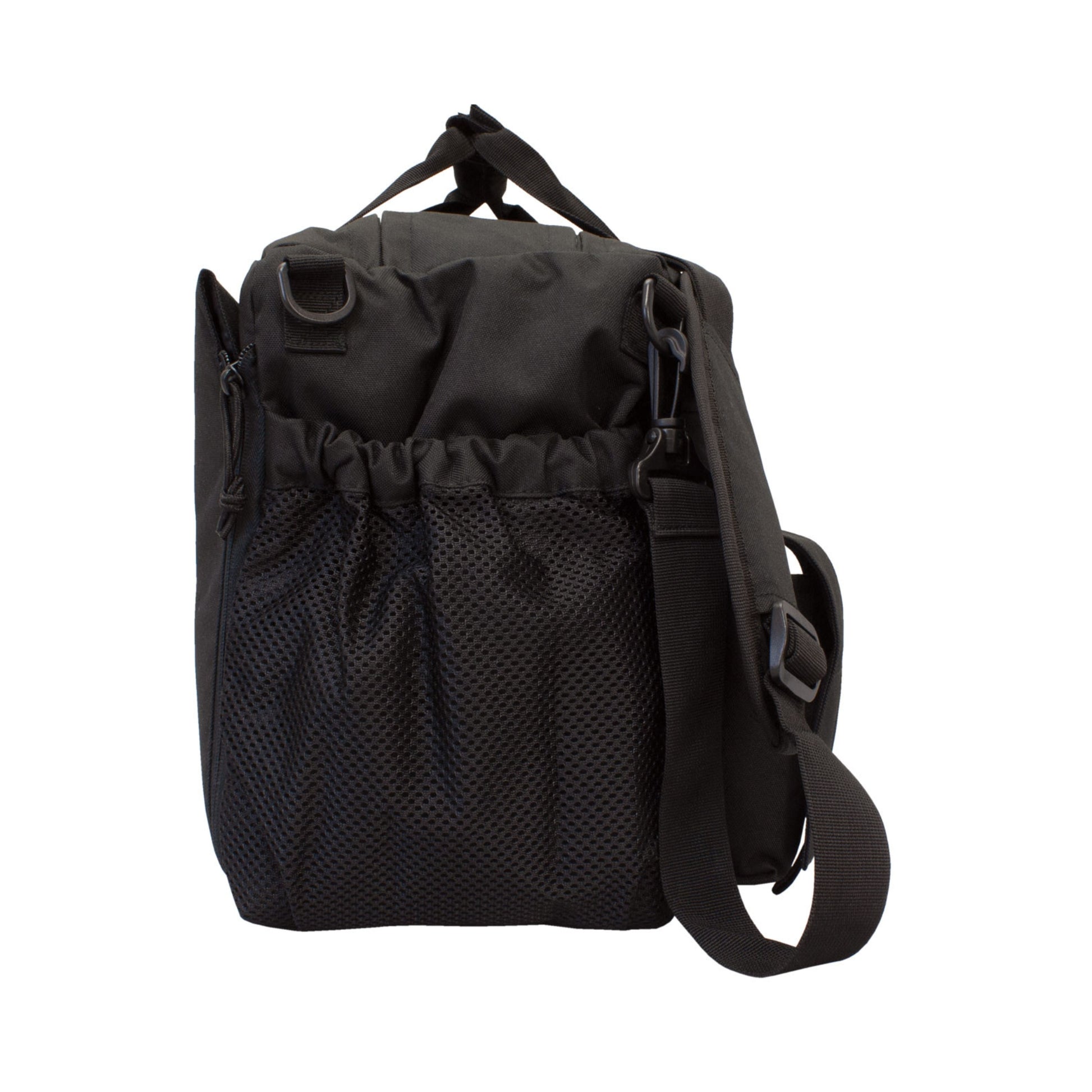 For comfortable carry, the bag features padded carry handles with touch-fastener wrap and a reconfigurable padded shoulder strap that can attach to any of the four D-ring connection points. Dual elastic mesh sleeves on each side provide convenient storage for water bottles, binoculars, or additional accessories.